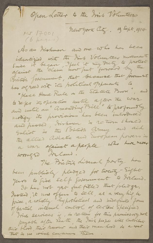 Meanwhile Casement had been a member of the Gaelic League for some years and participated in its cultural activities whenever he was in Ireland. He was learning Irish and had an active interest in Irish literature, history and tradition. It would also appear that by the time he left the consular service around 1911 he had become disillusioned with the British empire and what he had come to regard as its unjust dominion over Ireland. Moreover, he became increasingly radicalised by the opposition of the Ulster unionists to Home Rule from 1912 onwards. On the foundation of the Irish Volunteers in November 1913, he became a member of the provisional committee. When the war broke out in August 1914 he was in the United States raising funds for the Irish Volunteers. In the new political scenario, he identified Germany as a potential Irish ally and he determined to seek German assistance.