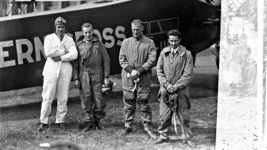 Transatlantic Flights: Crew of the "Southern Cross" at Portmarnock. L-R: Captain JP Saul, Navigator, Sir Charles Kingsford-Smith, Skipper, JW Stannage and Van Dyck, Independent Newspapers Collection (IND H 2842)