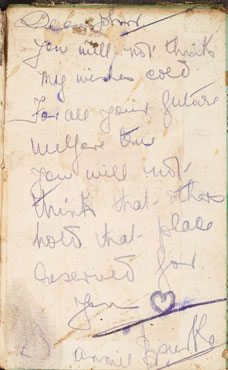 The book was published in approximately 1860 and belonged to a “W. John Gorman”. Could this be the same “John” who the love note was intended for? The note is signed – “Annie [Bourke?] It reads: