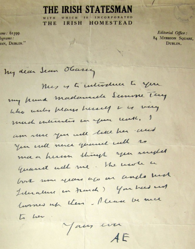 Letter from AE to Sean O'Casey introducing Simone Téry. NLI ref. Ms. 27,026